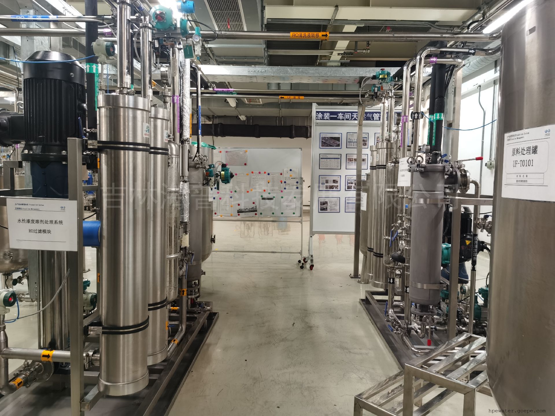 According to the confirmation of the test results, we confirmed that the combined membrane separation process was used topurify and concentrate the waste spray paint cleaning solution step by step, that is, the macromolecular substances such as waste paint in the cleaning solution were concentrated by the corresponding membrane separation process first, so asto reduce the discharge of waste cleaning solution and reduce the cost of sewage outsourcing treatment. It is estimated that the permeate produced is 70-75% of the original volume. The primary permeate is further purified by a secondary membrane process to remove low molecular substances and salts. The secondary produced water meets the requirements of spray cleaning process water and can be recycled as pure water to reduce water consumption. In order to ensure water quality, a tertiary membrane purification process is adopted. In order to ensure the stability of the water quality, * the concentrated water of the final membrane purification system is returned to the ultrafiltration inlet tank orultrafiltration concentrated liquid collection tank, * more than70-80% ofthe clean water is finally recovered, and the waste liquid is concentrated to more than20-30%, thus achieving the purpose of energy saving and emission reduction.The project was invited to participate inthe Painting Branch of China Automotive Engineering Society in 2019 for special lectures and technical exchanges, whichwere highly recognized and praised by experts in automobile coating industry and enterprise coating engineers attending the meeting. Many enterprisesexpressed their desire for further technical exchanges and promotion of the application of this technical achievement.